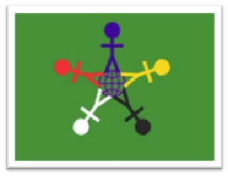 На зеленом фоне, фон символизирует рост, гармонию, свежесть и плодородие, вокруг знака Земли размещены стилизованные фигурки — красная, желтая, синяя, белая и черная.