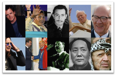 Жертвами этой болезни стали такие известные личности, как политик Ясер Арафат, Папа Римский Иоанн Павел II, боксер Мохаммед Али. Болезнь Паркинсона среди политиков была у китайского лидера Мао Цзэдуна (в его последние годы жизни) и у испанского диктатора Франсиско Франко. Был диагностирован этот недуг у известного художника Сальвадора Дали, поэта Андрея Вознесенского и американского актера Майкла Джей Фокса, который играл Марти Макфлая в ленте «Назад в будущее».