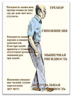 Более характерные симптомы — тремор кистей рук (пальцы как будто считают монеты), замедленные движения, нарушение походки и равновесия, слабость мышц лица и горла (трудно глотать, слюнотечение).