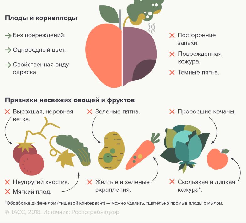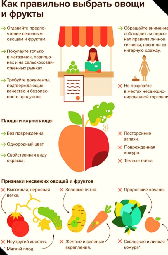 - Обязательно при покупке обращайте внимание на внешний вид фруктов и овощей, а также на условия их хранения.