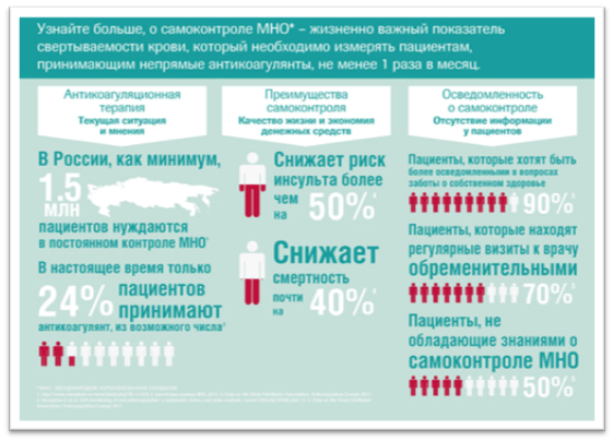 Таким пациентам необходимо регулярно сдавать анализ на МНО — жизненно важный показатель свертываемости крови. К сожалению, далеко не все пациенты, которым это необходимо, регулярно измеряют свертываемость крови. Но во всемирный день тромбоза измерить этот показатель необходимо и не составит большого труда. В этот день во многих городах пройдет акция, которая призвана обратить внимание на проблему своевременного контроля уровня свертываемости крови и все пациенты, принимающие непрямые антикоагулянты, смогут бесплатно измерить свертываемость крови (МНО), а также получить консультацию специалиста. Записаться на прием и получить информацию, нужно ли измерять МНО именно вам, можно по бесплатному телефону горячей линии 8-800-100-19-68 и на сайте www.mnoportal.ru.