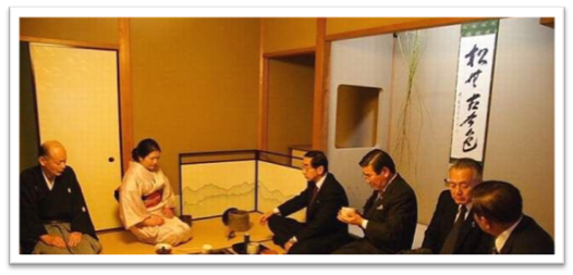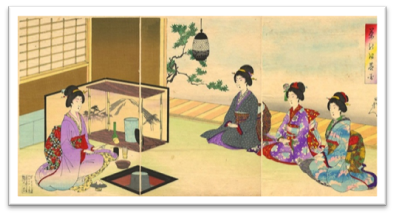 Входя в чайную комнату, где стоит жаровня для чайника, гость вежливо кланяется. Затем, держа перед собой складной веер, выражает восхищение висящим в нише свитком. Закончив осмотр, благодарные гости садятся и приветствуют хозяина.