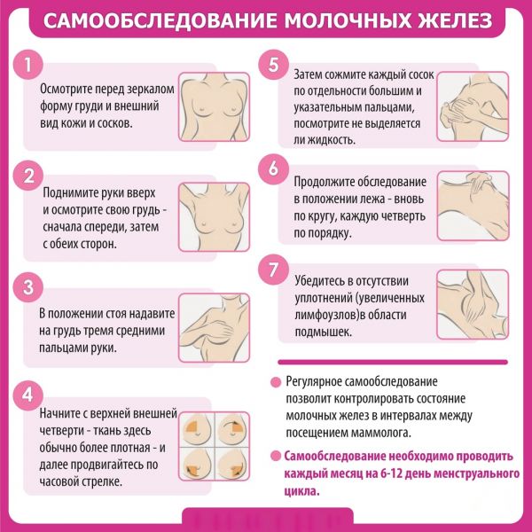 Каждая женщина должна помнить о том, что ее здоровье зависит прежде всего от нее самой, и проводить самообследование груди 1 раз в 3—4 месяца в 7—12-й дни цикла, когда грудь, как правило, безболезненна.
