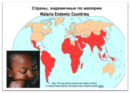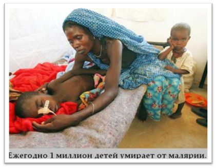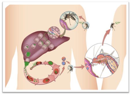 Малярия — паразитарная тропическая болезнь, характеризующаяся приступами лихорадки, анемией и увеличением селезенки, передается от больного человека к здоровому преимущественно при укусе малярийных комаров, но возможны и другие пути заражения. Попавшие, в организм человека во время укуса малярийных комаров паразиты циркулируют в крови, а затем заносятся в печень, в клетках которой и развиваются.
