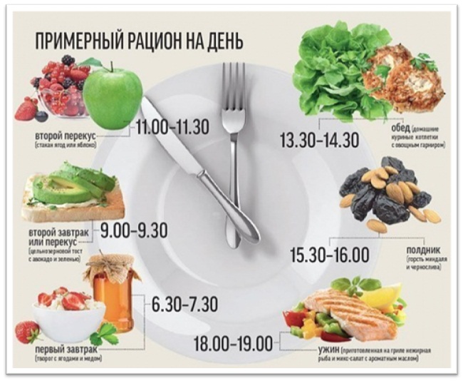·        Ежедневный рацион должен быть организован таким образом, что приёмы пищи происходят в одно и то же время и сбалансированы по объёму. Завтрак должен иметь энергоёмкость до трети всего суточного рациона, обед - до 60 процентов, и ужин - 10-20%. Причём белковые продукты лучше употреблять в первой половине дня, оставляя для ужина лёгкие овощные блюда, фрукты, пюре, рагу.