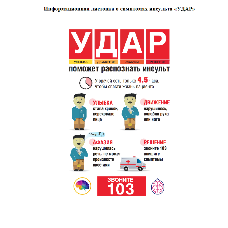 Необходимо разъяснить населению, что очень важно сразу распознать симптомы инсульта, ведь чем раньше начато лечение, тем лучше человек восстанавливается после инсульта. При возникновении подозрений на инсульт необходимо срочно вызвать бригаду скорой медицинской помощи и немедленно госпитализировать пациента. Экстренность госпитализации и начала терапии обусловлена существованием для инсульта так называемого терапевтического окна (4-4,5 часа), начало лечения в пределах которого может свести к минимуму или вовсе устранить тяжелые последствия этого заболевания.