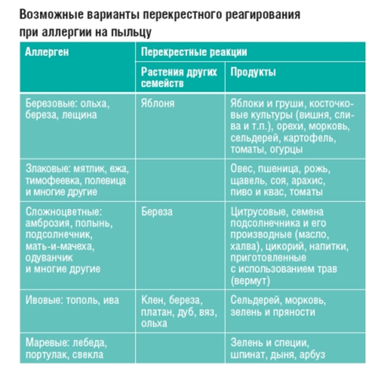 Замечено, что употребление в пищу продуктов, содержащих растительные компоненты, людьми, страдающими пыльцевой аллергией, может привести к появлению таких же симптомов, как и при вдыхании пыльцы. У людей, страдающих повышенной чувствительностью к грибковым аллергенам, те же явления могут возникать при употреблении в пищу продуктов, подвергшихся ферментации в период приготовления. Эта разновидность пищевой аллергии называется перекрестной. Поэтому в период активного цветения или спорообразования грибов мы рекомендуем вам особенно строго придерживаться диеты, которая позволит избежать ухудшения состояния. В более редких случаях симптомы могут возникать только при употреблении продуктов растительного происхождения. При этом симптомов аллергии при вдыхании пыльцы или спор не отмечается. В этом случае постоянное соблюдение индивидуальной гипоаллергенной диеты становится обязательным.