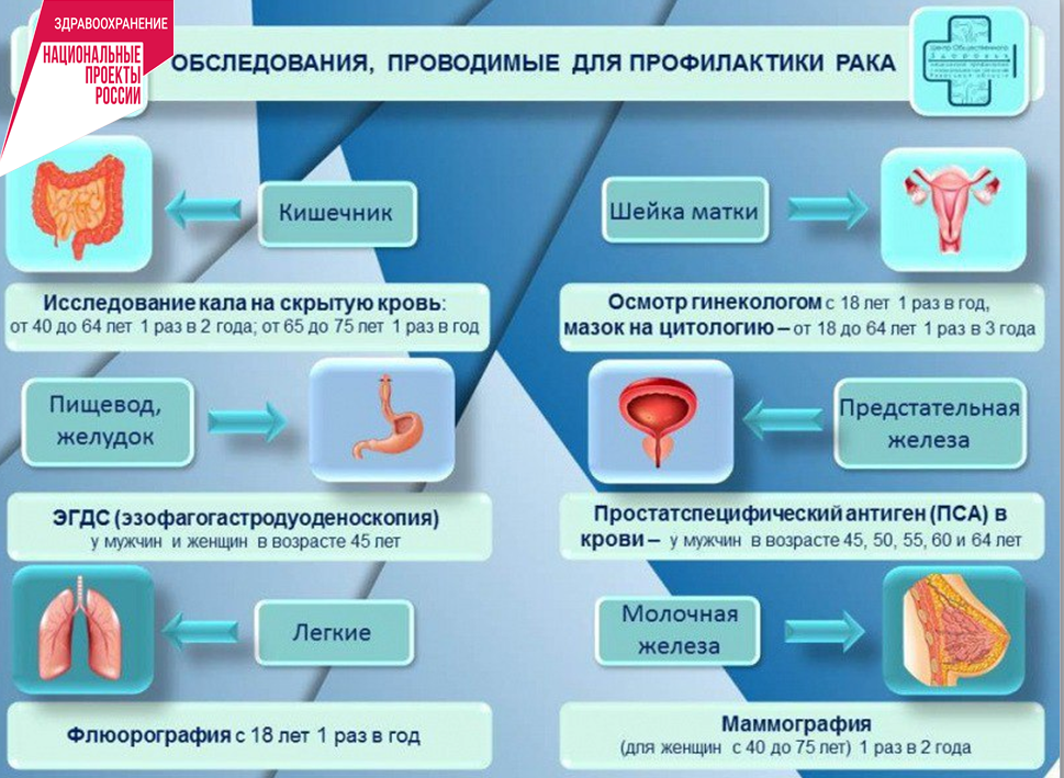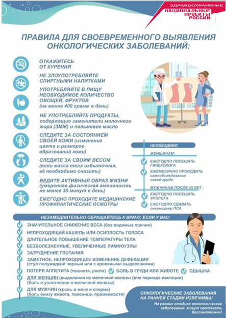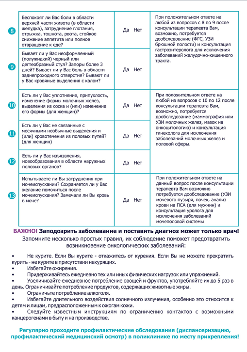 Необходимо знать, что на ранних стадиях онкологические заболевания себя никак не проявляют, и именно поэтому надо регулярно проходить обследования. Ведь большинство случаев рака можно вылечить, если обнаружить болезнь вовремя.