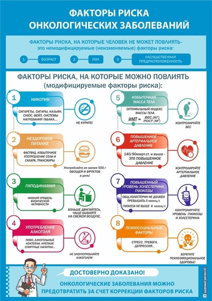 Для того, чтобы предупредить развитие рака, человек, в первую очередь, должен знать степень риска его развития у себя. Риск развития онкологических заболеваний зависит от многих факторов: наследственной отягощенности, неблагоприятных факторов внешней среды, наличия вредных привычек, уровня физической активности человека, неправильного питания и хронических заболеваний.