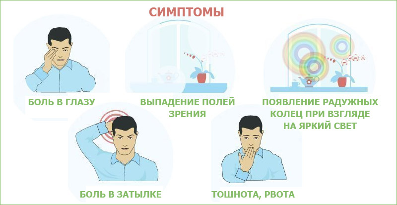 К основным симптомам глаукомы относятся: затуманивание зрения, сужение поля зрения, появление «сетки» перед глазами, ухудшение зрения в сумерках и появление радужных кругов при взгляде на источник света (например, лампочку), чувство дискомфорта в глазу (ощущение тяжести и напряжения).