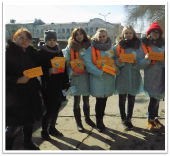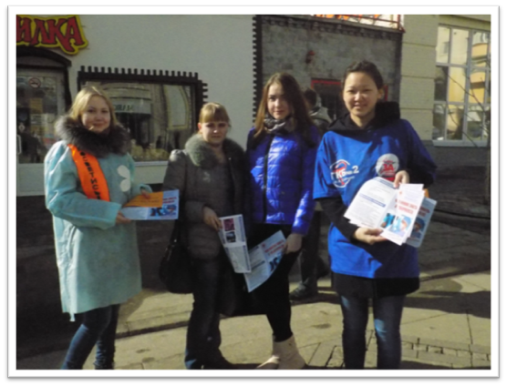 Наши волонтёры в униформах с ромашками. Раздали примерно 1000 листовок и буклетов.