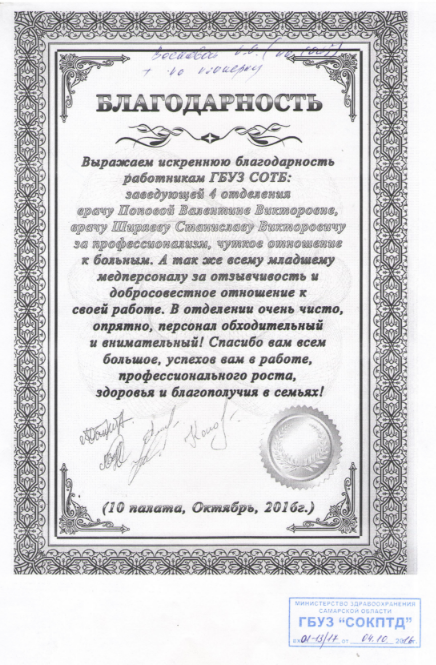 Здравствуйте, хочу сказать спасибо за человеческое отношение врачей к пациентам второго ТЛХО, а также отдельное спасибо психологу Людмиле Владимировне, которая всегда найдёт время что-бы выслушать и снять тяжёлое эмоциональное состояние, что необходимо узнав о болезни или возможной операции. Ещё раз спасибо.