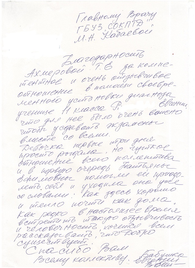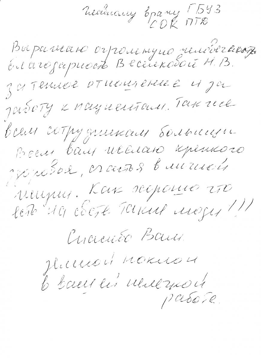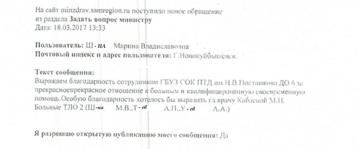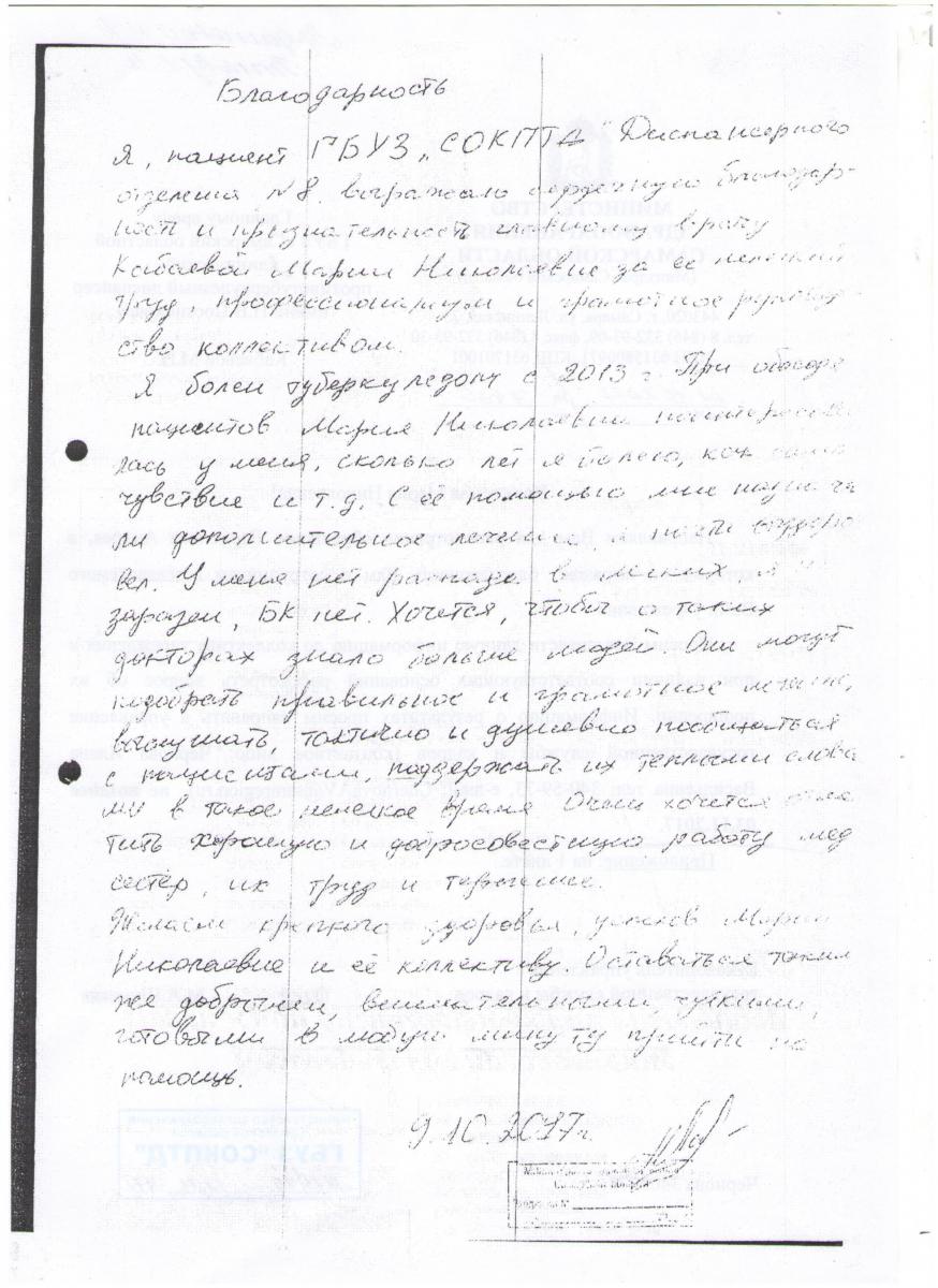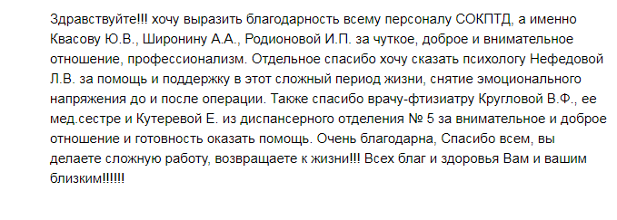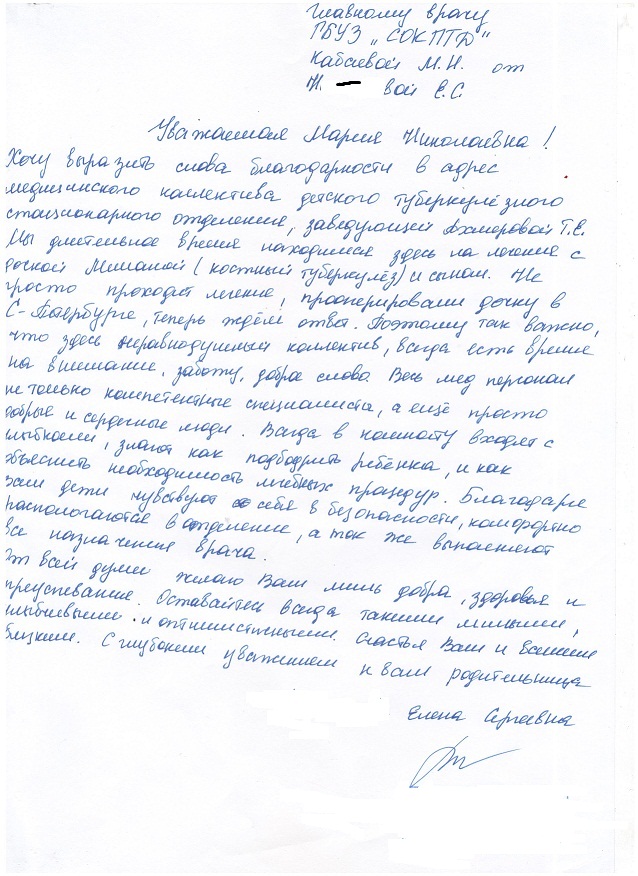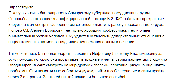 Уважаемая Марина Николаевна, мы очень благодарны Вам и вашему коллективу врачей и медсестрам ГБУЗ СОКПТБ, за их терпение к нам пациентам, самоотверженность в их тяжелой и опасной работе, за их трудолюбие и просим Вас и ваш руководящий состав рассмотреть нашу следующую просьбу и пожелание в связи с праздничным днём 8-ое марта, поздравить и поощрить от своего имени за трудолюбие, внимательное отношение и чуткость к своим пациентам: