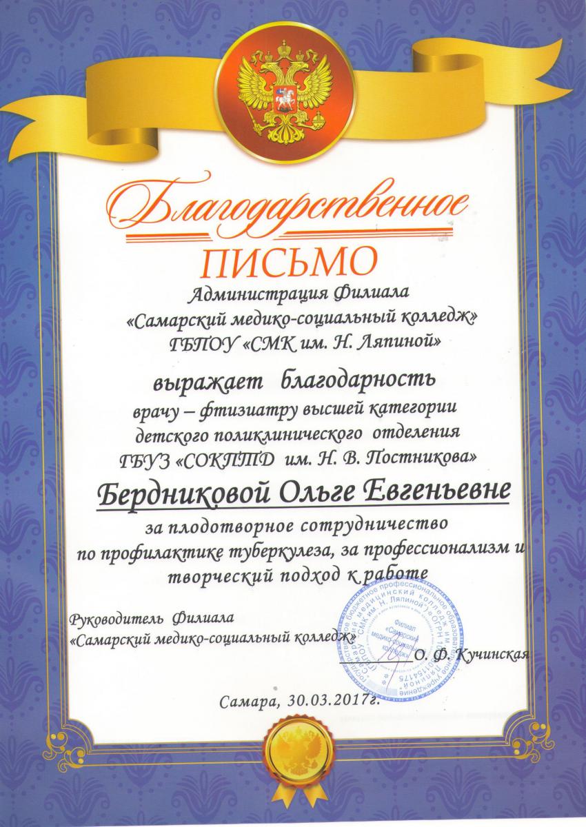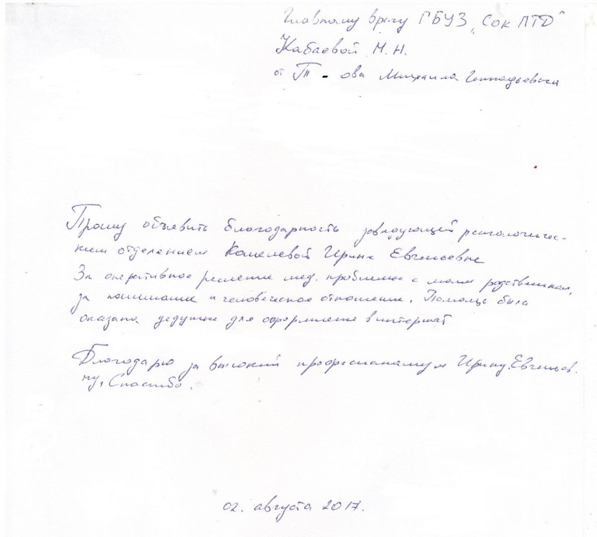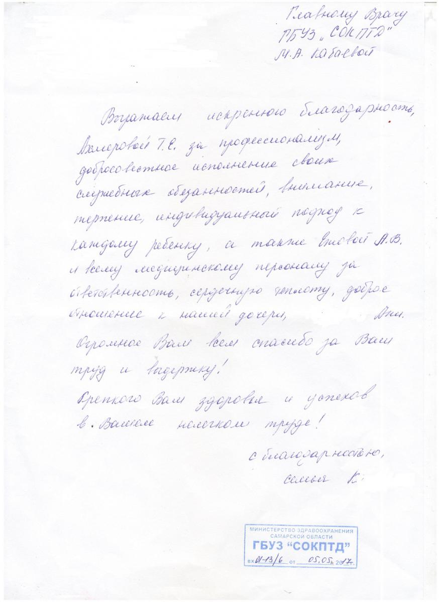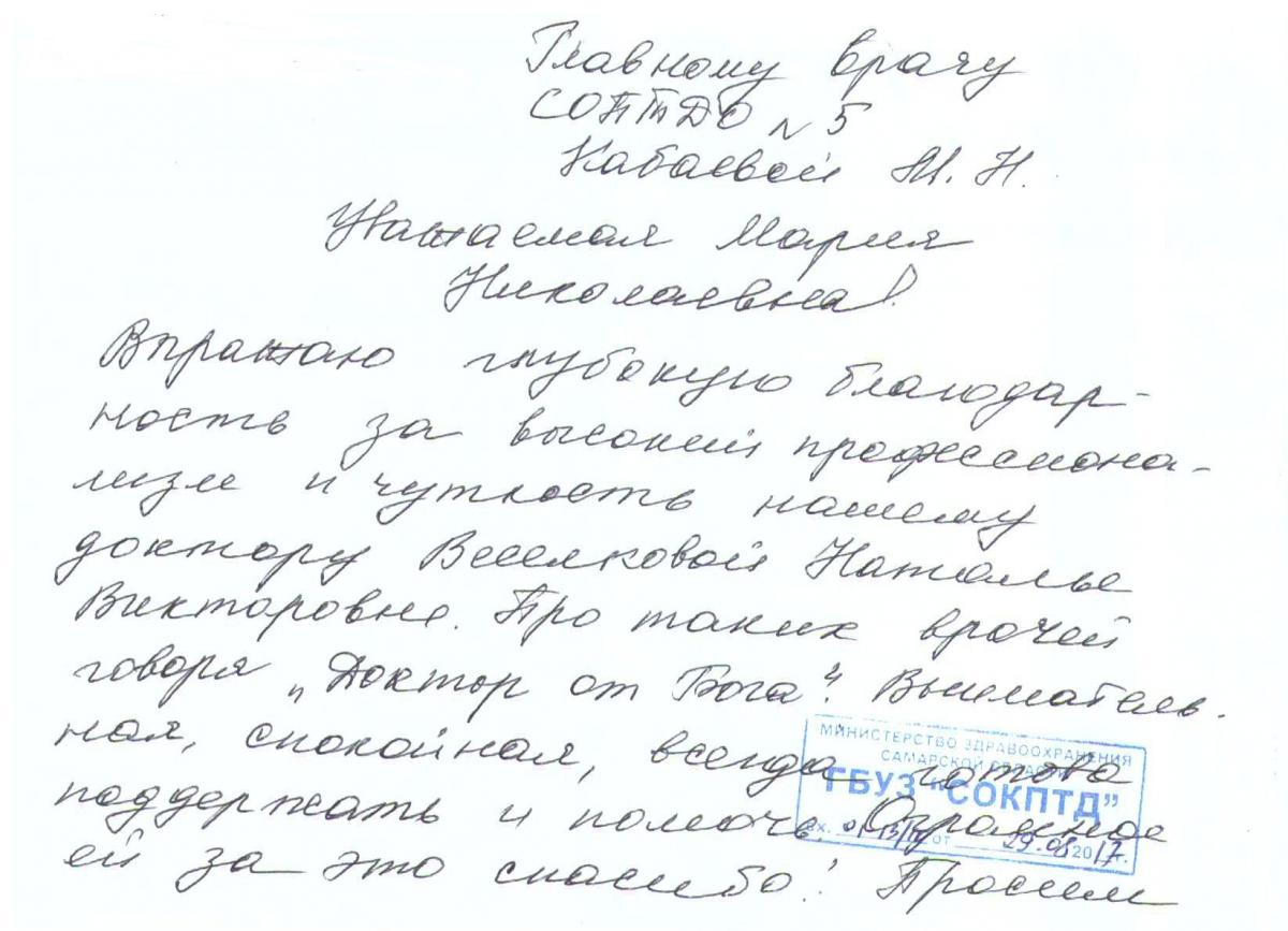 Уважаемая Марина Николаевна, мы очень благодарны Вам и вашему коллективу врачей и медсестрам ГБУЗ СОКПТБ, за их терпение к нам пациентам, самоотверженность в их тяжелой и опасной работе, за их трудолюбие и просим Вас и ваш руководящий состав рассмотреть нашу следующую просьбу и пожелание в связи с праздничным днём 8-ое марта, поздравить и поощрить от своего имени за трудолюбие, внимательное отношение и чуткость к своим пациентам: