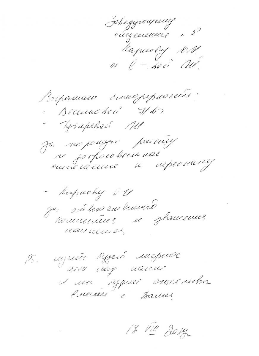 Заведующего 2 отделения ТСО-2 Маткину Татьяну Николаевну и Заведующего 4 отделения ТСО-2 Попову Валентину Викторовну, а также коллективы 2 и 4 отделений, медсестёр и сестёр – хозяек, технических работников этих отделений и кухонных работников больницы.