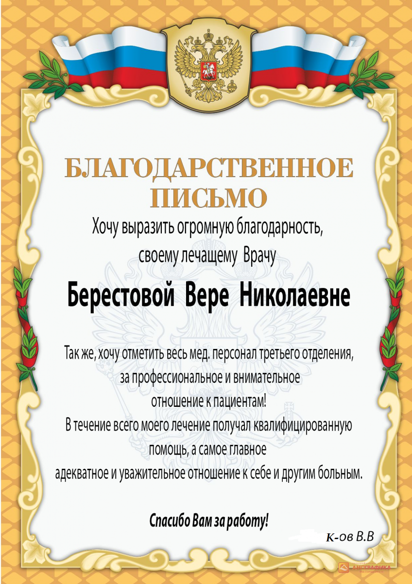 Валентину Викторовна Попову – заведующую 4-го отделения ТСО-2, коллектив медсестер 4-го отд. ТСО-2 И. В. Шумейкину, Е. В. Баташову, Т. В. Беспалову, Н. Г. Тумановскую, ст. медсестру М. Е. Жмыкову – у них всегда внимательное и заботливое отношение к нам – пациентам, сестру хозяйку О. Ю. Садскую и уборщиц – Мишурскую Т. С., Семочкину М. А., Ануфриеву Н. Д. – они всегда поддерживают чистоту и порядок в отделении, палатах и ухаживают за тяжелобольными, буфетчиц – Воронову Т. А. и Ефременко З. П.