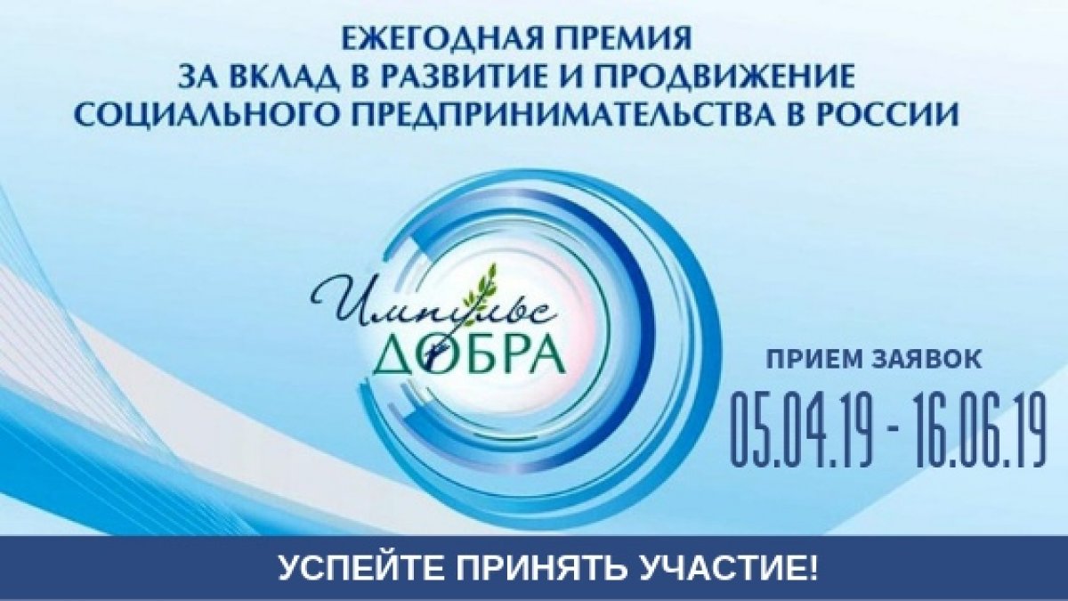 5 апреля 2019 года стартовал прием заявок на соискание Премии «Импульс добра», вручаемой за вклад в развитие и продвижение социального предпринимательства в России.