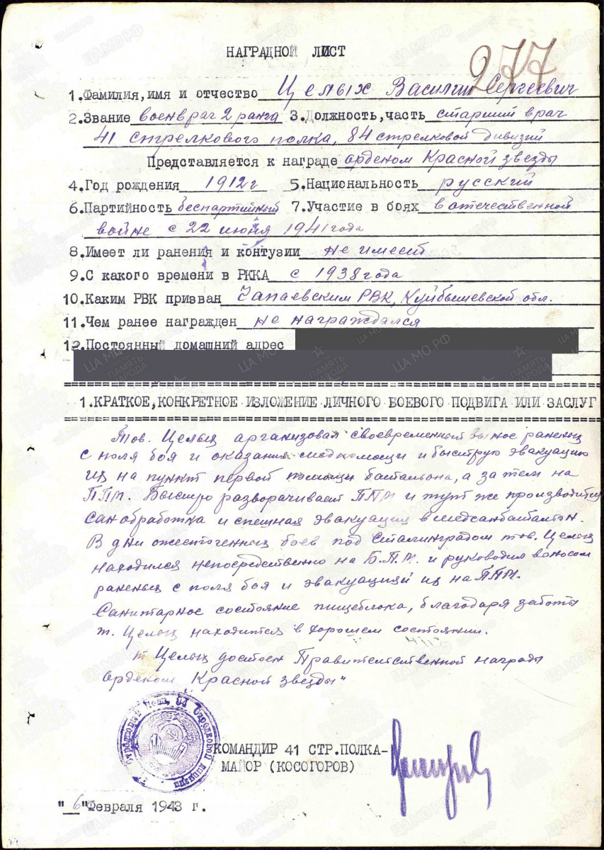Целых Василий Сергеевич родился 23.01.1912 года в Саратовской области, село Николаевка, Ивантеевского района. В1938 году призван в Красную Армию Чапаевским РВК Куйбышевской области. Свой боевой путь начал в составе 41 стрелкового полка под г. Львовом. 24 июня 1941 года в районе расположения полка появилась танковая колонна противника. Силы были неравные и, после ожесточённых боёв, 25 июня полк, отступая с боями, вышел в район между Винницей и Киевом, а затем через Смоленск к Великому Новгороду, где находился до 12 сентября 1942 года. Далее после переформирования боевой путь продолжился в район Сталинграда. За участие в боях за Сталинград 21.02.1943г. старший врач 41 стрелкового полка Василий Сергеевич получил свою первую награду - медаль «За боевые заслуги».