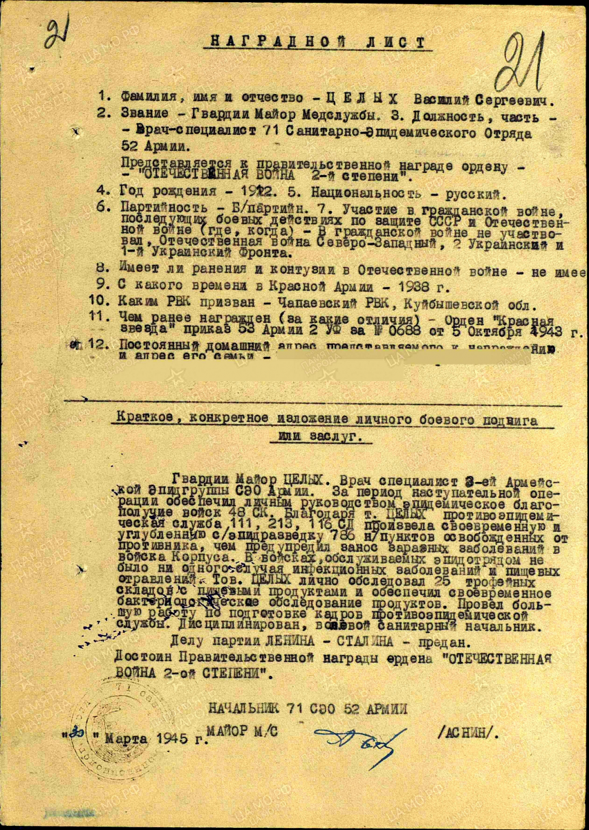 14 июня 1945 года гвардии майор мед. службы, врач - специалист санитарно-эпидемического отряда 52 Армии Целых В,С. награждён «Орденом Отечественной войны II степени».