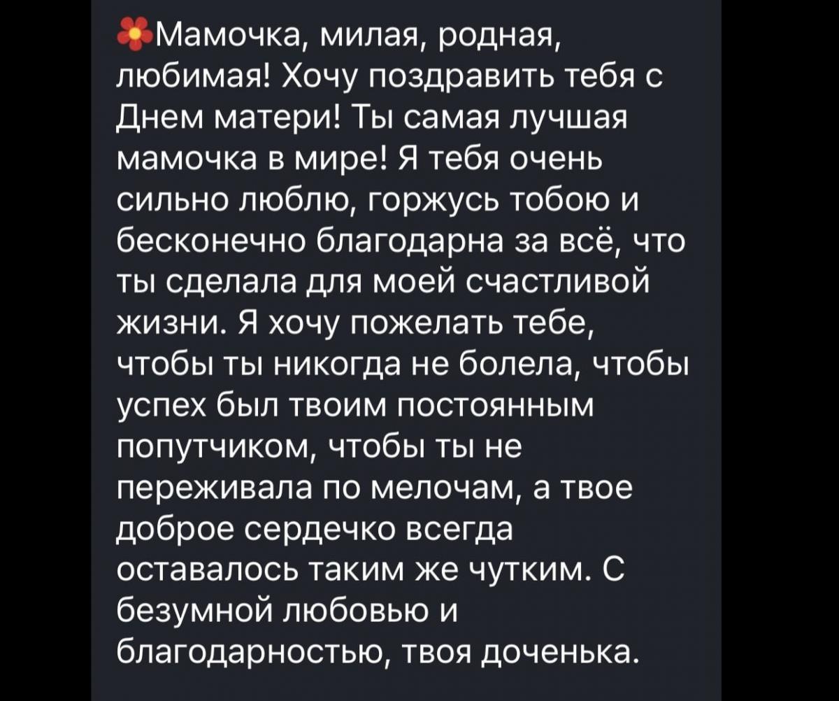 Как приятно мамам получать поздравления в этот трогательный праздник от детей, а когда ребенок стал взрослым и поздравление это благодарность и признание в любви самому дорогому человеку, то это трогает до слёз! Эльвира Васильевна Татаренцева заведующая отделением организации и контроля качества медицинской помощи детям делится с нами тёплым и трогательным поздравлением, которое получила к Дню Матери от доченьки Евгении.