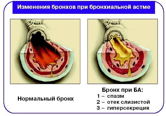 У предрасположенных лиц этот процесс приводит к развитию генерализованной бронхиальной обструкции различной степени выраженности, полностью или частично обратимой спонтанно или под влиянием лечения. Воспалительный процесс вызывает также содружественное усиление ответа дыхательных путей в виде бронхиальной обструкции на различные внешние и внутренние стимулы».