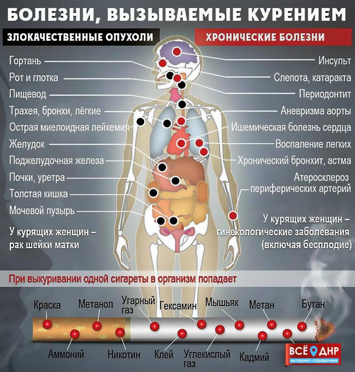 Учеными установлено, что при выкуривании одной пачки сигарет человек получает дозу радиации в семь раз больше той, которая признана предельно допустимой. А радиация табачного происхождения вкупе с другими канцерогенными веществами — главная причина возникновения рака. У курящих рак легких встречается в 20 раз чаще, чем у некурящих.