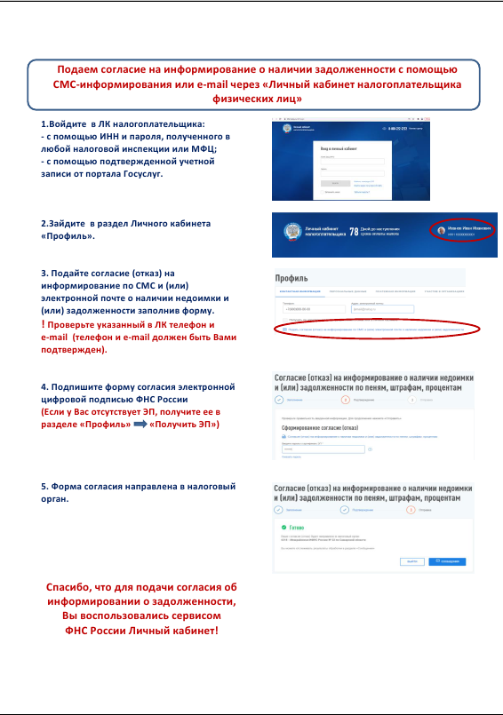 В соответствии с пунктом 7 статьи 31 Налогового кодекса РФ налоговые органы имеют право информировать налогоплательщиков о налоговой задолженности с помощью СМС – сообщений, электронной почты или иными способами при условии получения их согласия на такое информирование в письменной форме.