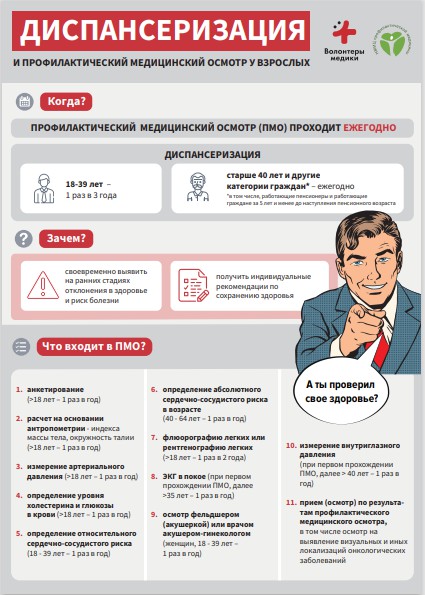 Что делать если Вашего возраста нет в списке для диспансеризации. Какой осмотр Вы можете пройти?Если Вашего возраста нет в списке для диспансеризации, Вы все равно можете обратиться в свою поликлинику и пройти профилактический медосмотр. Он также проводится для раннего выявления заболеваний и факторов риска их развития, но в отличие от диспансеризации включает меньший объем обследований. Преимущество профилактического медосмотра в том, что его можно проходить в любом возрасте по желанию пациента. Медицинский осмотр проводится бесплатно, ежегодно, записавшись на прием к своему участковому врачу или придя в отделение (кабинет) медицинской профилактики.