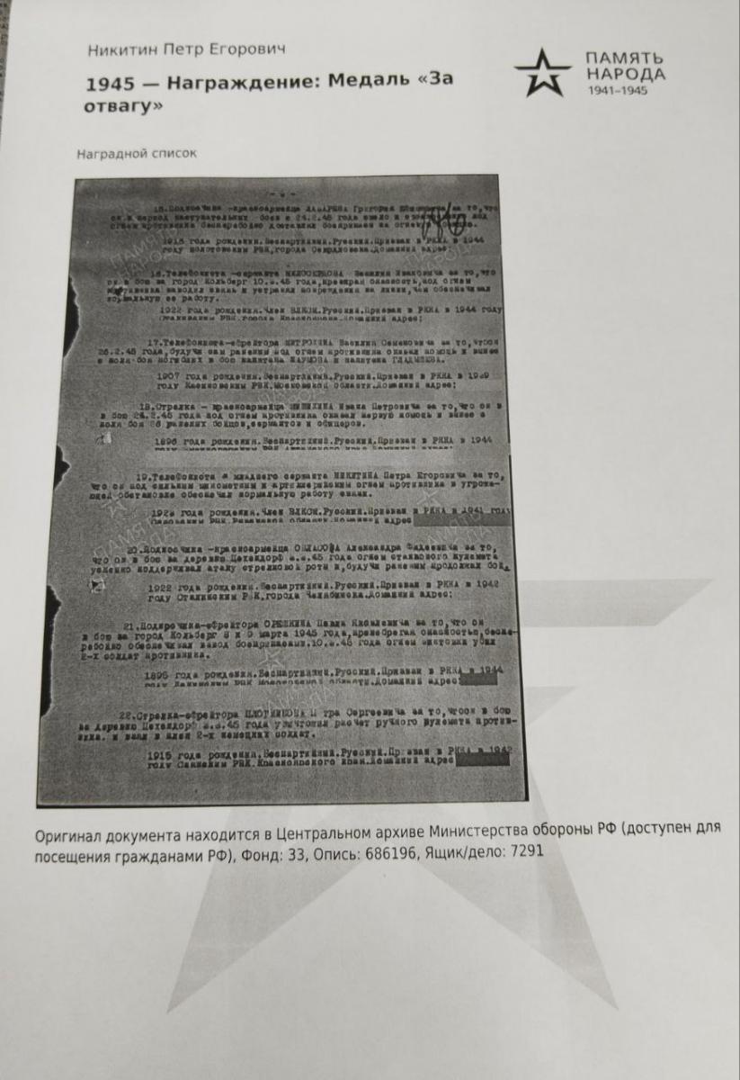 Выписка из приказа о награждении: Телефониста и младшего сержанта Никитина Петра Егоровича наградить за то,что он под сильным миномётным и артеллирийским огнем противника в угрожающей обстановке обеспечил нормальную работу связи.