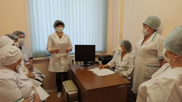 На фото 3 и.о. старшей медицинской сестры диспансерного отделения №8 Рахманкулова Елена Васильевна знакомит персонал с правилами забора и транспортировки биоматериала на анализ при подозрении на коронавирусную инфекцию.