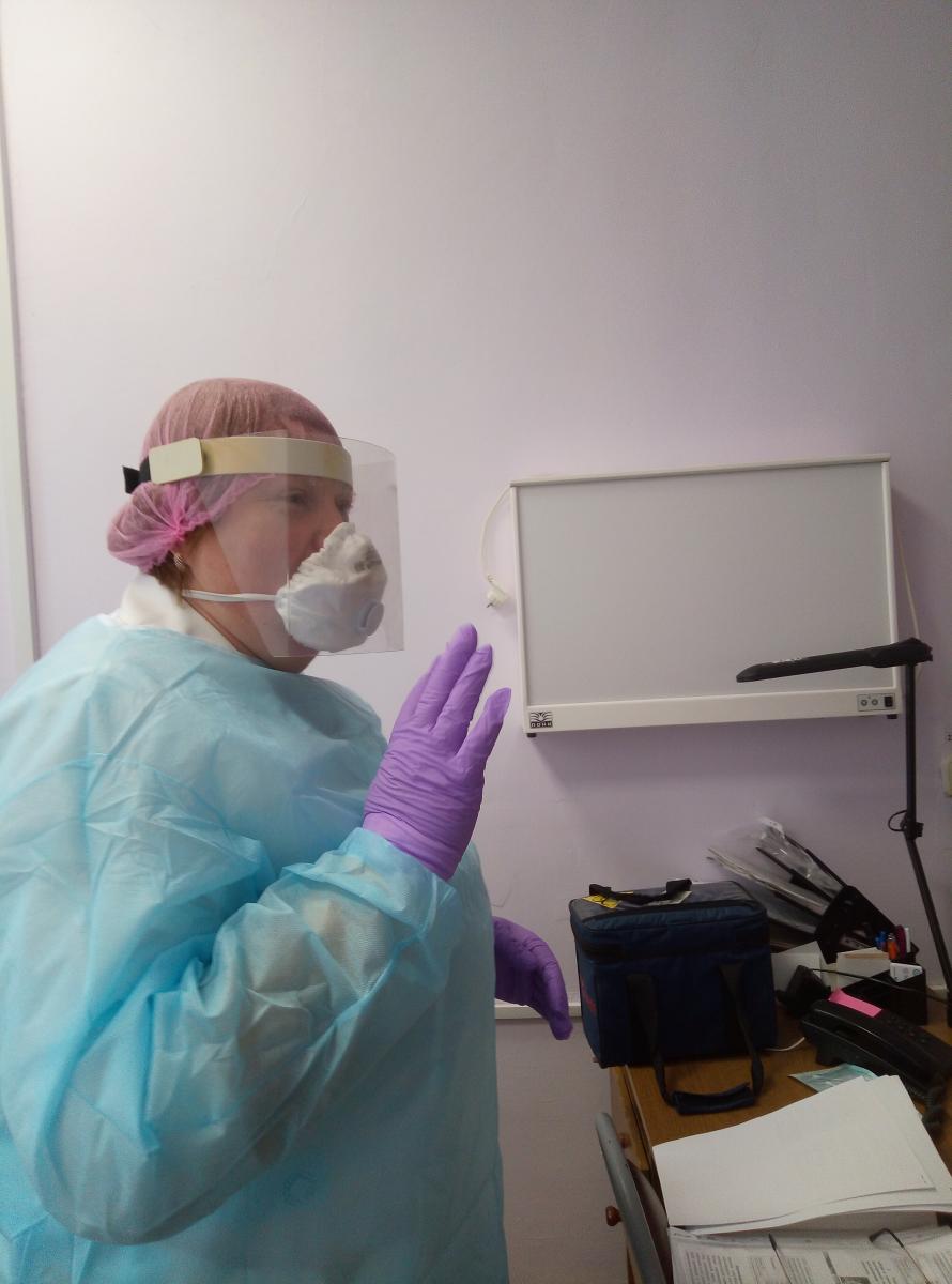 На фото 2 старшая  медицинская сестра Диспансерного отделения № 3  Садовниченко Н.Н. на практике знакомит правильному облачению в защитный костюм
