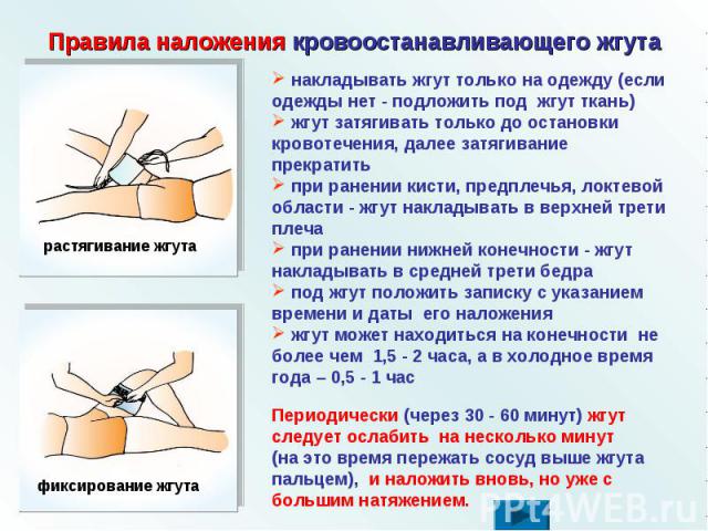 Жгут на конечности можно накладывать максимум на 1 час. По его истечении жгут необходимо ослабить на 10-15 минут. При необходимости затянуть вновь, но не более, чем на 20 минут.