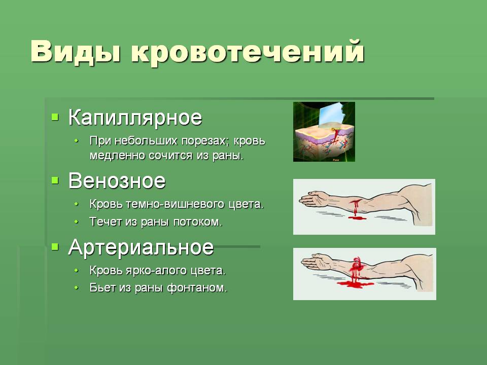 Остановка капиллярного кровотечения осуществляется путем наложения асептической повязки, а также, если ранены руки или ноги, поднятием конечностей выше уровня туловища.