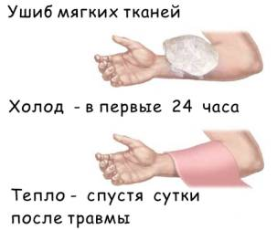 Ушибы лечат так же, как и растяжения. Сразу после травмы рекомендуется наложить холодный компресс или пузырь со льдом, обеспечить абсолютный покой, наложить давящую повязку.