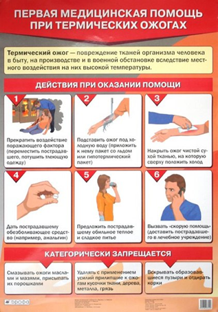 Держите место ожога чистым и сухим, закройте его чистой неплотной повязкой, если ожог покрывается пузырями, немедленно покажите пострадавшего медикам. Самостоятельно не вскрывайте пузыри – они защищают пораженное место. Не отрывайте то, что прилипло к месту ожога. Не прикладывайте к месту ожога ничего кроме холодной воды.