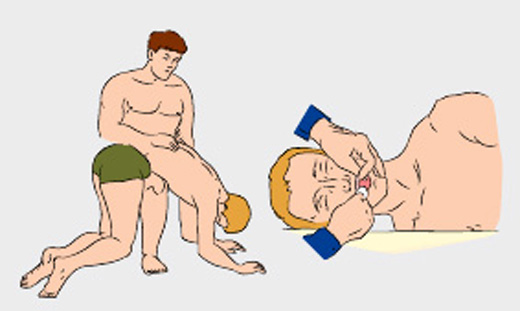 Если функция кровообращения сохранена (пульсация на сонных артериях), на нет дыхания, полость рта освобождают от инородных тел. Для этого её очищают пальцем, обёрнутым бинтом, удаляют съёмные зубные протезы. Нередко рот пострадавшего невозможно открыть из-за спазма жевательных мышц. В этих случаях проводят искусственное дыхание "рот в нос"; при неэффективности этого метода используют роторасширитель, а если его нет, то применяют какой-либо плоский металлический предмет (не сломать зубы!). Что касается освобождения верхних дыхательных путей от воды и пены, то лучше всего для этих целей применить отсос. Если его нет, пострадавшего укладывают животом вниз на бедро спасателя, согнутое в коленном суставе. Затем резко, энергично сжимают его грудную клетку. Эти манипуляции необходимы в тех случаях реанимации, когда проводить искусственную вентиляцию лёгких невозможно из-за перекрытия дыхательных путей водой или пеной. Проводить эту процедуру надо быстро и энергично. Если в течение нескольких секунд эффекта нет, надо приступать к искусственной вентиляции лёгких.