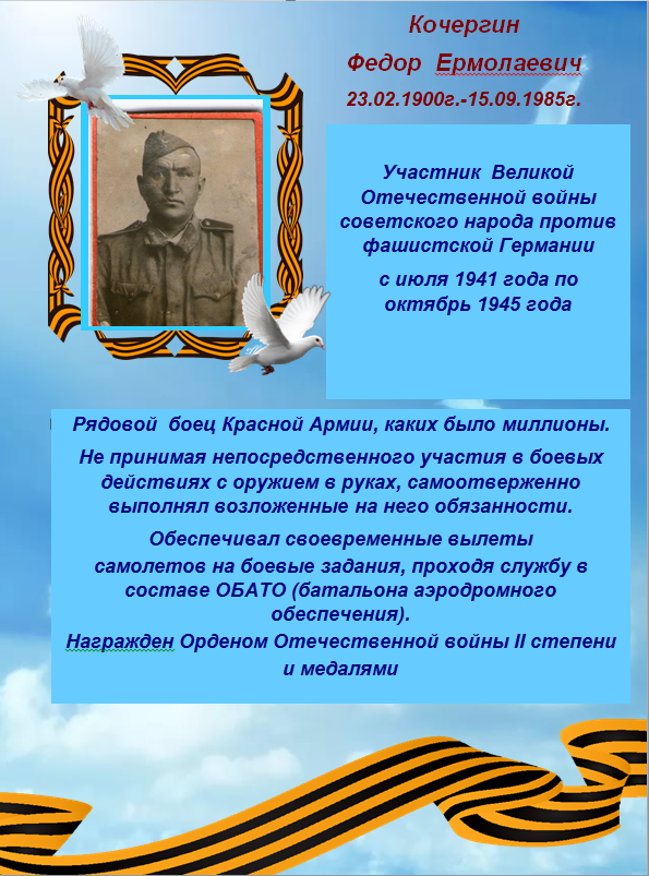 Поколение победителей:Кочергин Фёдор Ермолаевич ( о прадедушке рассказала Ембулатова Анна Фёдоровна. Заведующий канцелярией)