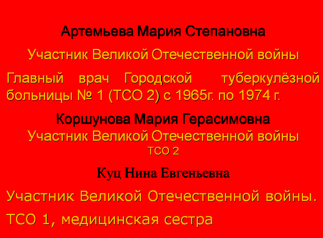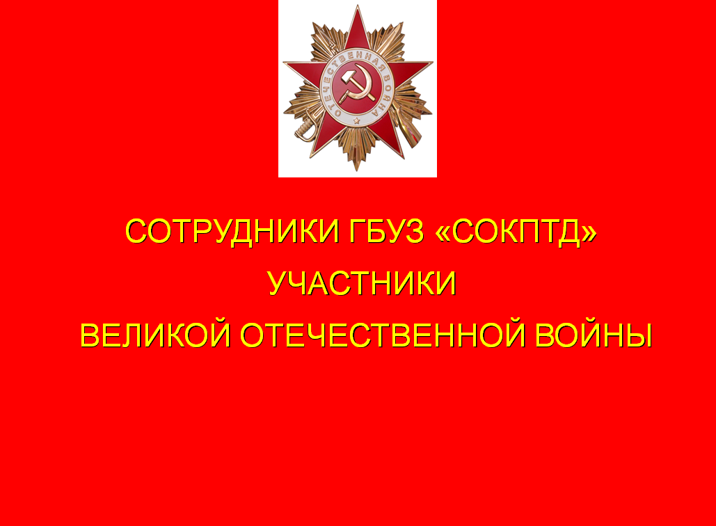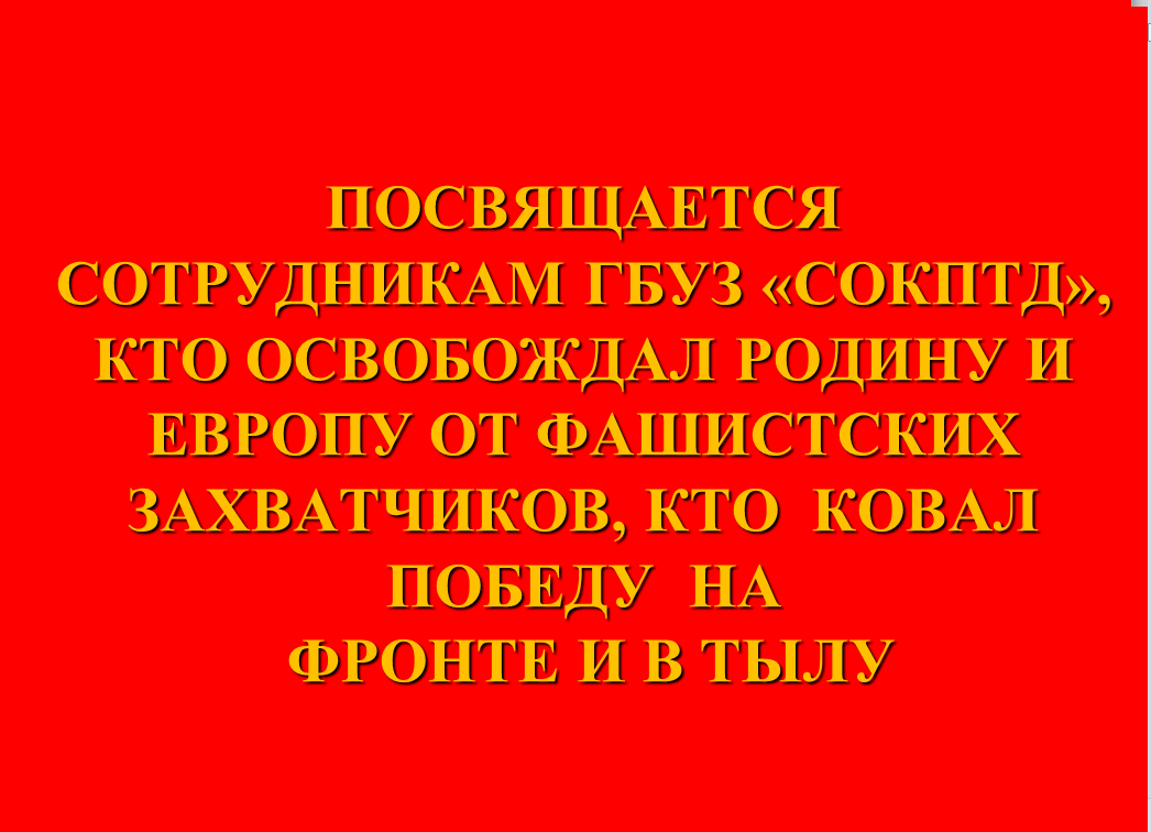 ПОСВЯЩАЕТСЯ СОТРУДНИКАМ ГБУЗ «СОКПТД», КТО ОСВОБОЖДАЛ РОДИНУ И ЕВРОПУ ОТ ФАШИСТСКИХ ЗАХВАТЧИКОВ, КТО КОВАЛ ПОБЕДУ НА ФРОНТЕ И В ТЫЛУ