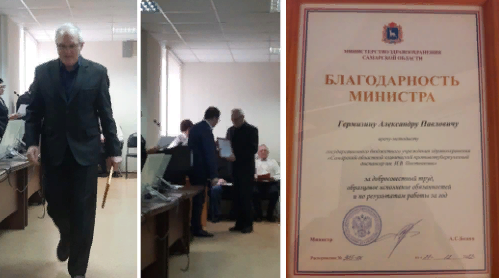 10 февраля 2023 года в Министерстве здравоохранения Самарской области состоялось итоговое совещание по направлениям гражданской обороны и мобилизационной работы. Врач-методист Самарского областного клинического противотуберкулëзного диспансера Гермизин Александр Павлович был награждëн заслуженной Благодарностью Министра.