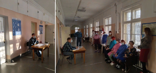В диспансерном отделении N°3 специалист по Гражданской обороне Логинов Алексей Юрьевич провел занятие с сотрудниками дневного стационара на тему: порядок получения сигнала "Внимание Всем!" с информацией о воздушной тревоге, химической тревоге, радиационной опасности или угрозе катастрофического затопления и действий работников диспансера и их получении ".