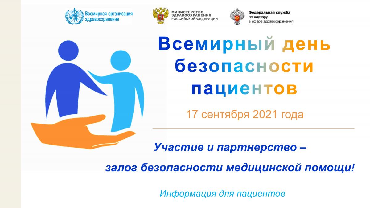 17 сентября 2021 г. Минздравом России совместно с Росздравнадзором и при взаимодействии с представительством ВОЗ в России запланированы мероприятия, посвященные Всемирному дню безопасности пациентов.