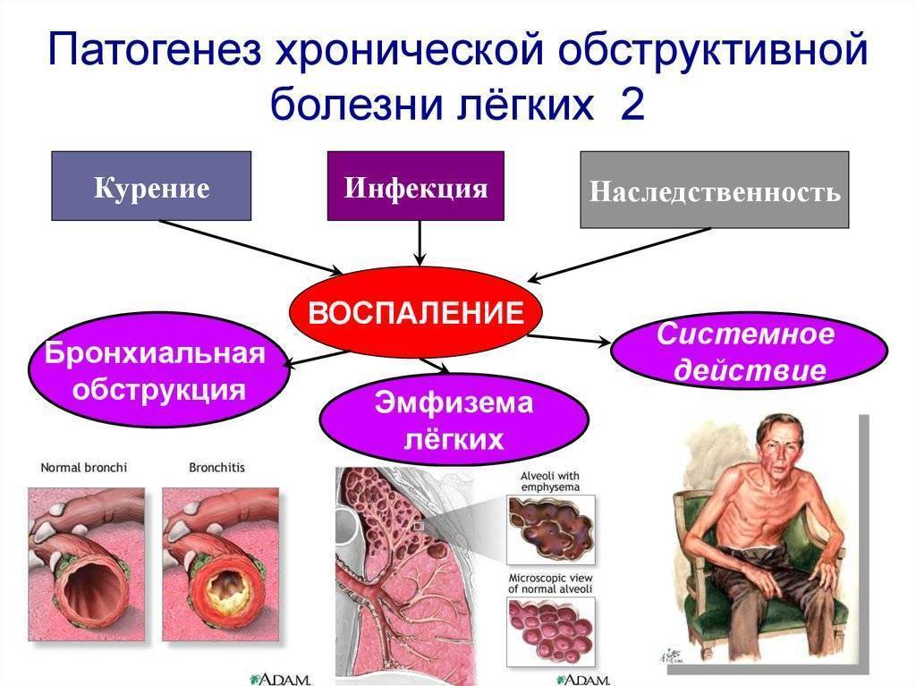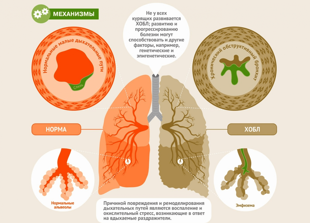 В результате данных воздействий развивается хроническое воспаление стенки бронхов, что, в свою очередь, приводит к сужению их просвета. Нарушение проходимости бронхиального дерева создаёт благоприятные условия для размножения инфекции, что также отягощает течение заболевания.