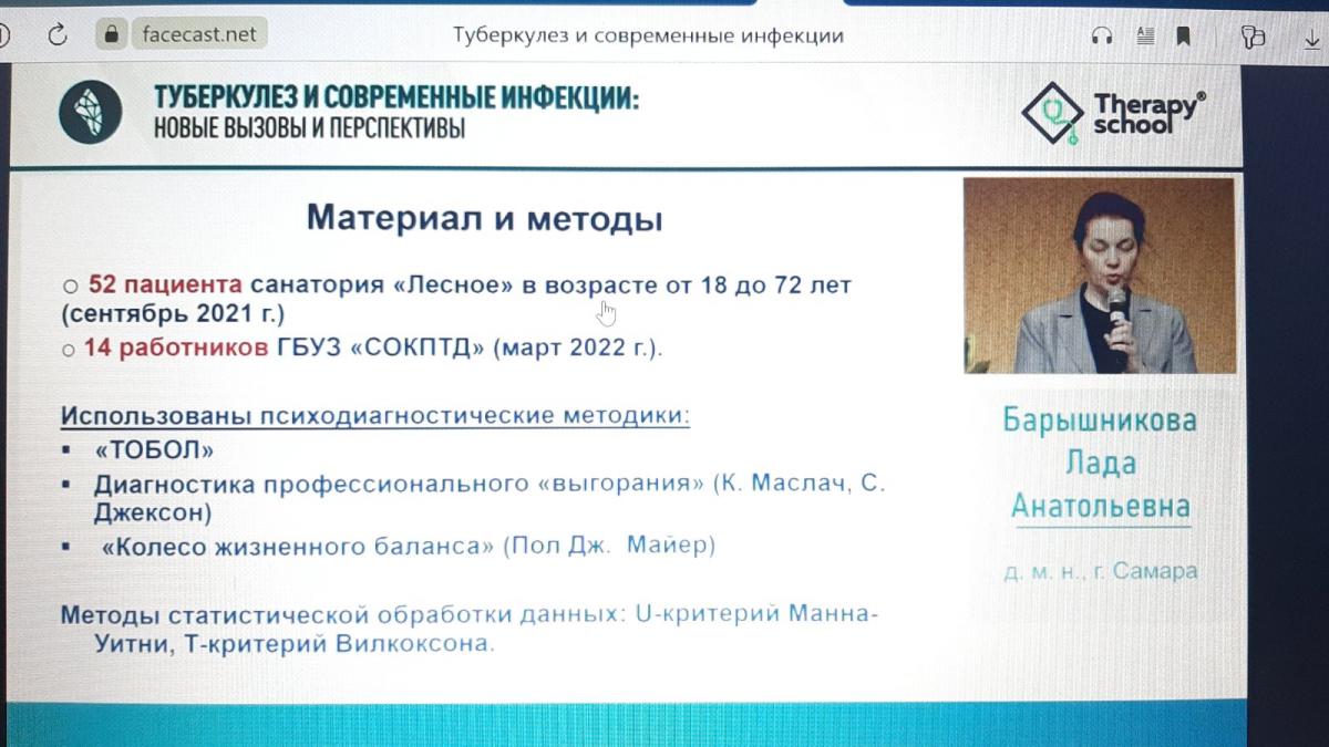 Сегодня с докладом перед собравшими специалистами выступила Лада Анатольевна Барышникова - д.м.н., главный внештатный специалист детский фтизиатр министерства здравоохранения Самарской области , заместитель главного врача по медицинской части ГБУЗ «Самарский областной клинический противотуберкулёзный диспансер им. Н.В. Постникова». В своём выступлении Лада Анатольевна затронула тему психологического сопровождения в противотуберкулёзной организации пациентов и медицинских работников.