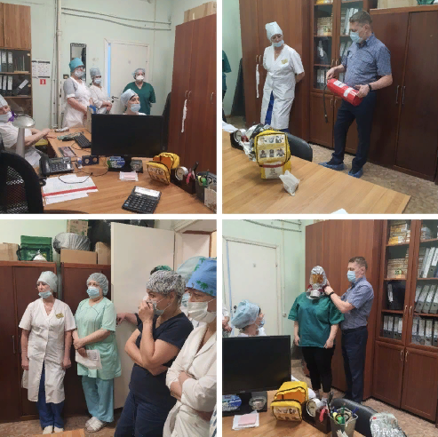 5 апреля в диспансерном отделении №5 прошла тренировка по теме: "Порядок и правила использования средств индивидуальной защиты, а также средств пожаротушения, имеющихся в ГБУЗ "СОКПТД".