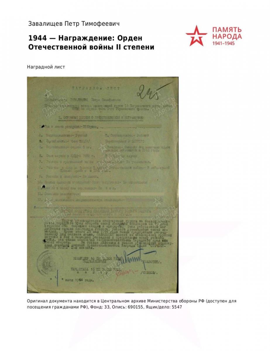 "Мой дедушка Завалищев Петр Тимофеевич (05.03.1919-14.07.1972) во время Великой Отечественной войны служил в 54 пограничном отряде войск НКВД и